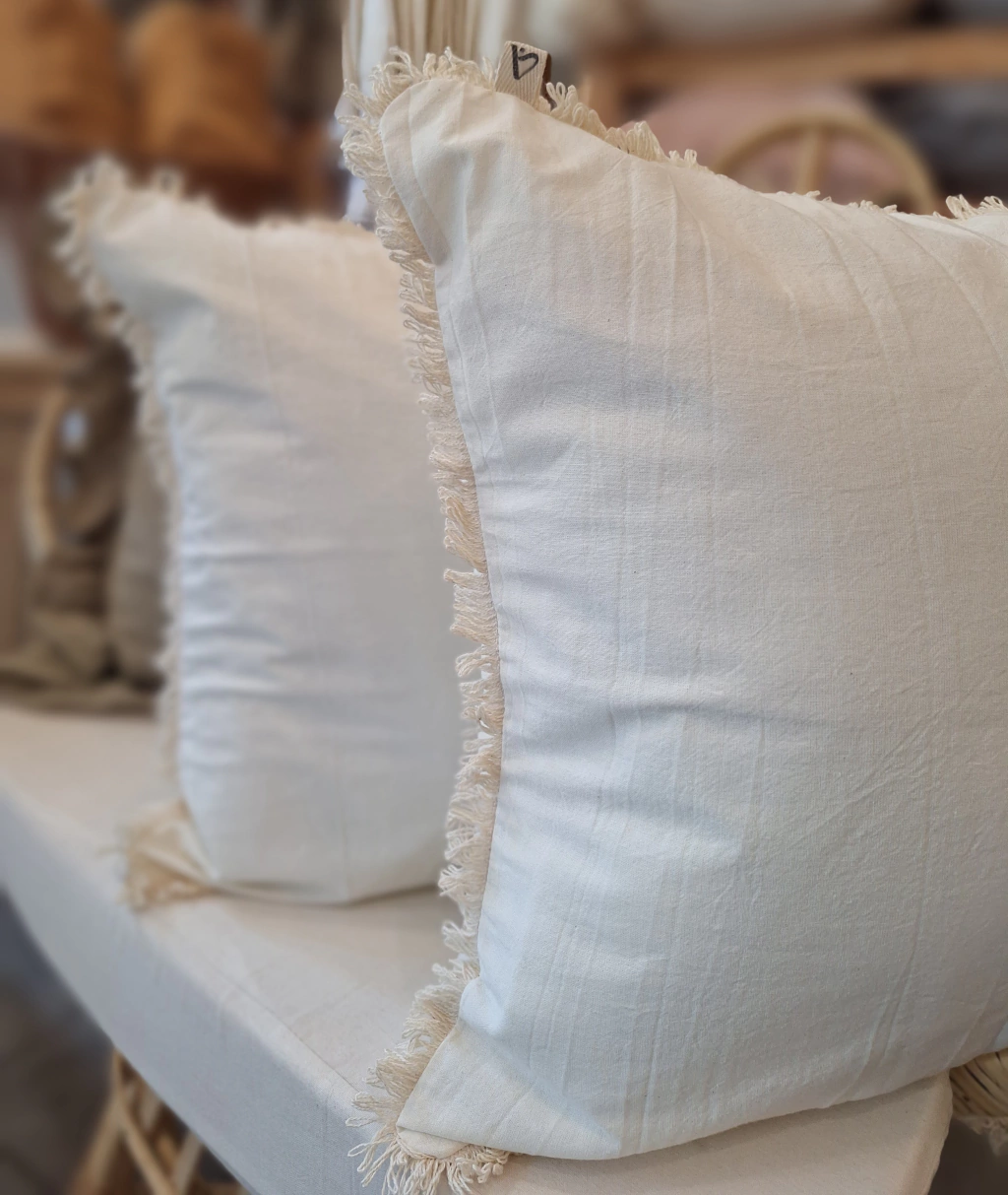 FUNDA DE ALMOHADON DE TUSSOR INTERVENIDO CON FLECOS DE ALGODÓN